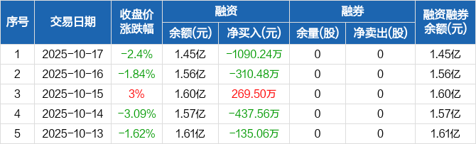 融资方面,当日融资买入766.66万元,融资偿还1856.89万元,融资净偿还1090.24万元。融券方面,融券卖出0股,融券偿还0股,融券余量0股,融券余额0元。融资融券余额合计1.45亿元。