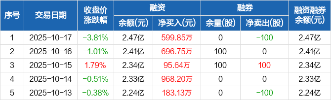 融资方面,当日融资买入2201.23万元,融资偿还1601.38万元,融资净买入599.85万元,连续7日净买入累计4072.57万元。融券方面,融券卖出0股,融券偿还100股,融券余量0股,融券余额0元。融资融券余额合计2.47亿元。