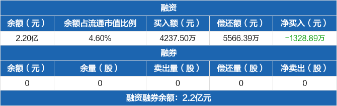 融资方面,当日融资买入4237.5万元,融资偿还5566.39万元,融资净偿还1328.89万元。融券方面,融券卖出0股,融券偿还0股,融券余量0股,融券余额0元。融资融券余额合计2.2亿元。