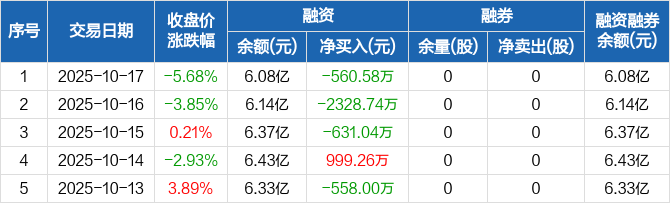 融资方面,当日融资买入5339.97万元,融资偿还5900.55万元,融资净偿还560.58万元,连续3日净偿还累计3520.35万元。融券方面,融券卖出0股,融券偿还0股,融券余量0股,融券余额0元。融资融券余额合计6.08亿元。