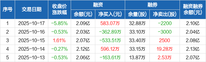 汉缆股份融资融券信息显示,2025年10月17日融资净买入583.07万元;融资余额2.09亿元,较前一日增加2.87%。
