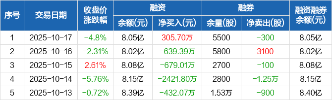 融资方面,当日融资买入4327.12万元,融资偿还4021.43万元,融资净买入305.7万元。融券方面,融券卖出0股,融券偿还300股,融券余量5500股,融券余额12.87万元。融资融券余额合计8.05亿元。