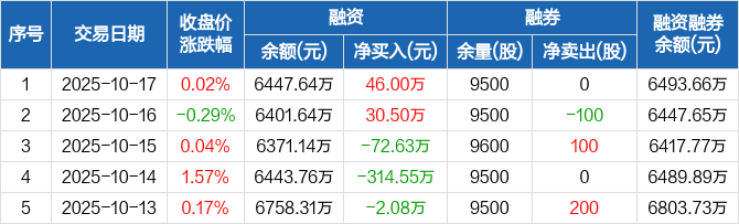 融资方面,当日融资买入632.05万元,融资偿还586.05万元,融资净买入46万元。融券方面,融券卖出0股,融券偿还0股,融券余量9500股,融券余额46.03万元。融资融券余额合计6493.66万元。