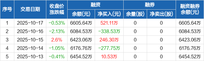 融资方面,当日融资买入1028.29万元,融资偿还507.18万元,融资净买入521.11万元。融券方面,融券卖出0股,融券偿还0股,融券余量0股,融券余额0元。融资融券余额合计6605.64万元。