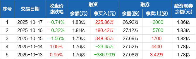 融资方面,当日融资买入890.23万元,融资偿还664.37万元,融资净买入225.86万元,连续3日净买入累计755.23万元。融券方面,融券卖出400股,融券偿还2400股,融券余量26.92万股,融券余额252.24万元。融资融券余额合计1.86亿元。