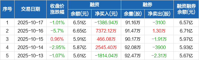 融资方面,当日融资买入2898.97万元,融资偿还4285.9万元,融资净偿还1386.94万元。融券方面,融券卖出2.74万股,融券偿还3.05万股,融券余量91.16万股,融券余额537.84万元。融资融券余额合计6.57亿元。