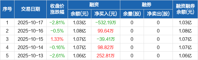 融资方面,当日融资买入341.05万元,融资偿还873.24万元,融资净偿还532.19万元。融券方面,融券卖出0股,融券偿还0股,融券余量0股,融券余额0元。融资融券余额合计1.03亿元。