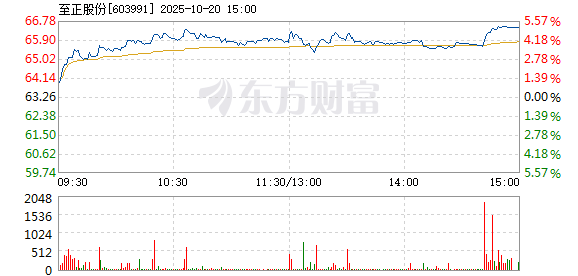 至正股份盘中快速上涨,5分钟内涨幅超过2%,截至9点34分,报65.3元,成交1284.21万元,换手率0.27%。