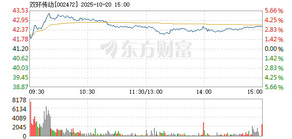 10月20日,双环传动盘中快速上涨,5分钟内涨幅超过2%,截至9点35分,报42.7元,成交1.01亿元,换手率0.32%。