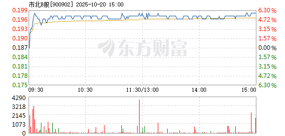 市北B股盘中快速上涨,5分钟内涨幅超过2%,截至9点35分,报0.198元,成交18.73万元,换手率0.21%。