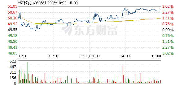*ST松发盘中快速回调,5分钟内跌幅超过2%,截至9点37分,报49.68元,成交1049.00万元,换手率0.17%。