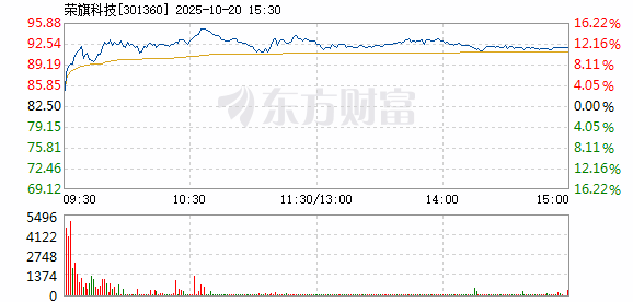 荣旗科技盘中快速回调,5分钟内跌幅超过2%,截至9点41分,报89.5元,成交2.36亿元,换手率10.39%。