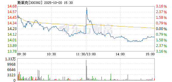 斯莱克盘中快速反弹,5分钟内涨幅超过2%,截至13点01分,报14.49元,成交2.05亿元,换手率2.22%。