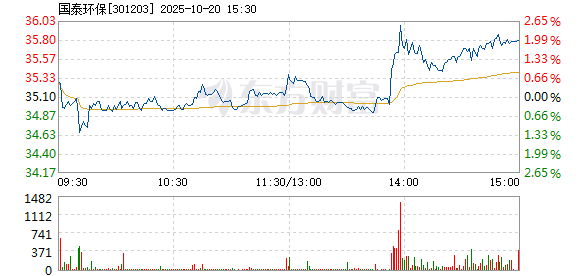 国泰环保盘中快速反弹,5分钟内涨幅超过2%,截至13点57分,报35.79元,成交4592.99万元,换手率2.98%。