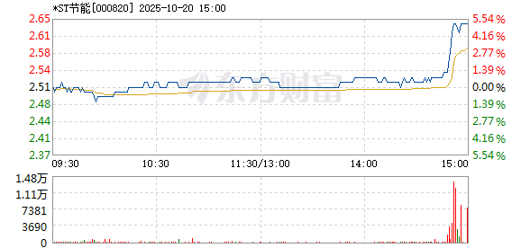 10月20日14点52分,*ST节能盘中涨停,报2.64元,目前封单3383手,折合89.31万元。截至目前,成交1244.68万元,换手率1.64%。