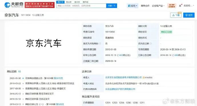 此外,天眼查App显示,北京京东叁佰陆拾度电子商务有限公司已申请注册多枚“京东汽车”“京东汽车 JD AUTO”“京东汽车 CAR.JD.COM”商标,国际分类为运输工具、科学仪器、广告销售等,当前部分商标已注册成功。
