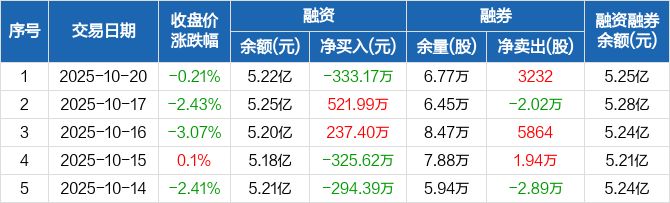 融资方面,当日融资买入1300.81万元,融资偿还1633.98万元,融资净偿还333.17万元。融券方面,融券卖出4963股,融券偿还1731股,融券余量6.77万股,融券余额320.66万元。融资融券余额合计5.25亿元。