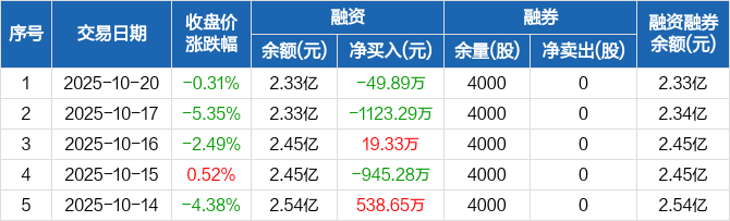 融资方面,当日融资买入1715.38万元,融资偿还1765.26万元,融资净偿还49.89万元。融券方面,融券卖出0股,融券偿还0股,融券余量4000股,融券余额7.83万元。融资融券余额合计2.33亿元。