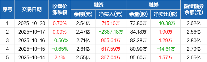 融资方面,当日融资买入1840.92万元,融资偿还1125.82万元,融资净买入715.1万元。融券方面,融券卖出300股,融券偿还10.41万股,融券余量73.8万股,融券余额786.71万元。融资融券余额合计2.62亿元。