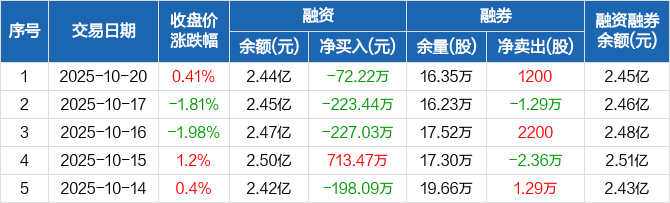 融资方面,当日融资买入726.44万元,融资偿还798.66万元,融资净偿还72.22万元,连续3日净偿还累计522.69万元。融券方面,融券卖出3100股,融券偿还1900股,融券余量16.35万股,融券余额79.95万元。融资融券余额合计2.45亿元。