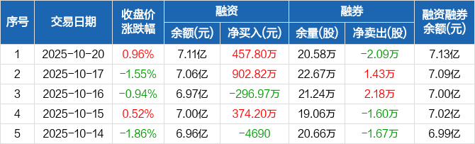 融资方面,当日融资买入2229.71万元,融资偿还1771.91万元,融资净买入457.8万元。融券方面,融券卖出2.5万股,融券偿还4.59万股,融券余量20.58万股,融券余额237.08万元。融资融券余额合计7.13亿元。