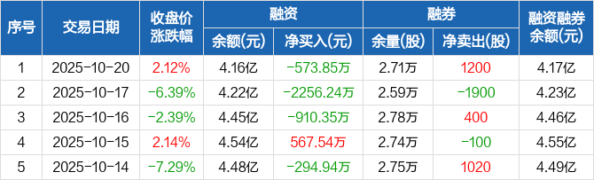 融资方面,当日融资买入2719.46万元,融资偿还3293.31万元,融资净偿还573.85万元,连续3日净偿还累计3740.44万元。融券方面,融券卖出1400股,融券偿还200股,融券余量2.71万股,融券余额93.86万元。融资融券余额合计4.17亿元。