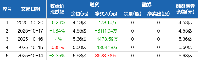 融资方面,当日融资买入1768.59万元,融资偿还1946.73万元,融资净偿还178.14万元,连续4日净偿还累计1.16亿元。融券方面,融券卖出0股,融券偿还0股,融券余量0股,融券余额0元。融资融券余额合计4.53亿元。