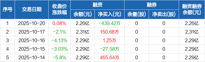 融资方面,当日融资买入1307.86万元,融资偿还1747.28万元,融资净偿还439.42万元。融券方面,融券卖出0股,融券偿还0股,融券余量0股,融券余额0元。融资融券余额合计2.26亿元。
