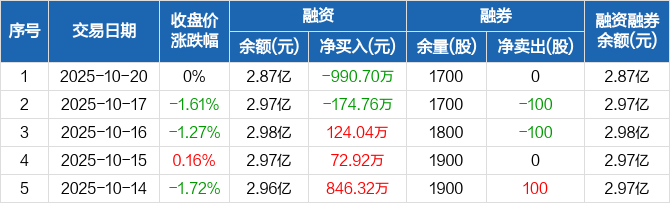 融资方面,当日融资买入737.45万元,融资偿还1728.15万元,融资净偿还990.7万元。融券方面,融券卖出0股,融券偿还0股,融券余量1700股,融券余额1.04万元。融资融券余额合计2.87亿元。