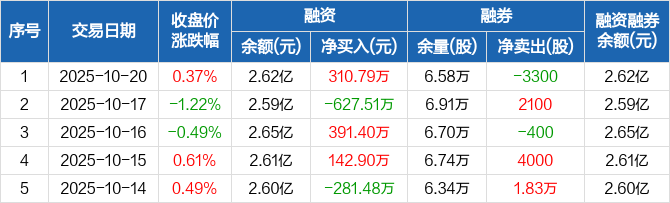 融资方面,当日融资买入1046.08万元,融资偿还735.29万元,融资净买入310.79万元。融券方面,融券卖出100股,融券偿还3400股,融券余量6.58万股,融券余额53.5万元。融资融券余额合计2.62亿元。