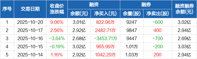 融资方面,当日融资买入4856.53万元,融资偿还4033.57万元,融资净买入822.96万元。融券方面,融券卖出200股,融券偿还800股,融券余量9247股,融券余额116.97万元。融资融券余额合计3.02亿元。