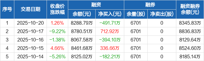 融资方面,当日融资买入615.29万元,融资偿还1107万元,融资净偿还491.71万元。融券方面,融券卖出0股,融券偿还0股,融券余量6701股,融券余额57.04万元。融资融券余额合计8345.83万元。