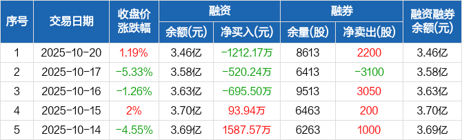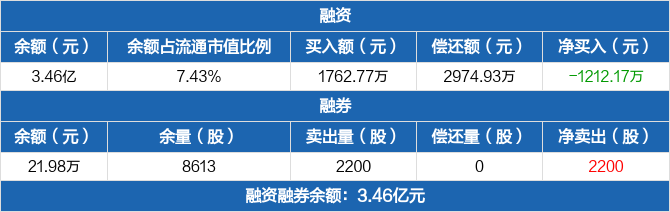 融资方面,当日融资买入1762.77万元,融资偿还2974.93万元,融资净偿还1212.17万元,连续3日净偿还累计2427.9万元。融券方面,融券卖出2200股,融券偿还0股,融券余量8613股,融券余额21.98万元。融资融券余额合计3.46亿元。