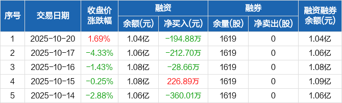 融资方面,当日融资买入185.43万元,融资偿还380.31万元,融资净偿还194.88万元,连续3日净偿还累计436.24万元。融券方面,融券卖出0股,融券偿还0股,融券余量1619股,融券余额5.63万元。融资融券余额合计1.04亿元。