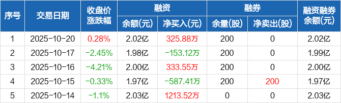 融资方面,当日融资买入683.72万元,融资偿还357.84万元,融资净买入325.88万元。融券方面,融券卖出0股,融券偿还0股,融券余量200股,融券余额5024元。融资融券余额合计2.02亿元。
