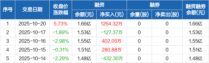 融资方面,当日融资买入3185.4万元,融资偿还1921.08万元,融资净买入1264.32万元。融券方面,融券卖出0股,融券偿还0股,融券余量0股,融券余额0元。融资融券余额合计1.66亿元。