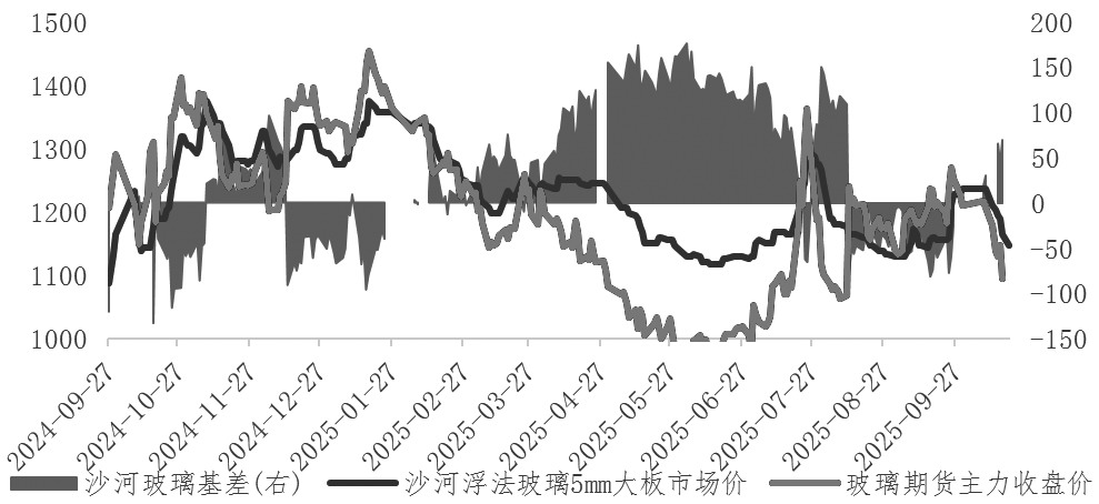 图为沙河玻璃期现货价格及基差走势(单位:元/吨)