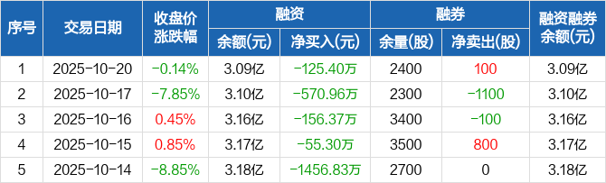 融资方面,当日融资买入2033.45万元,融资偿还2158.86万元,融资净偿还125.4万元,连续5日净偿还累计2364.86万元。融券方面,融券卖出800股,融券偿还700股,融券余量2400股,融券余额4.98万元。融资融券余额合计3.09亿元。