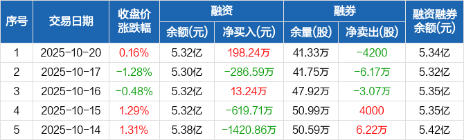 融资方面,当日融资买入1006.48万元,融资偿还808.24万元,融资净买入198.24万元。融券方面,融券卖出1200股,融券偿还5400股,融券余量41.33万股,融券余额255.01万元。融资融券余额合计5.34亿元。