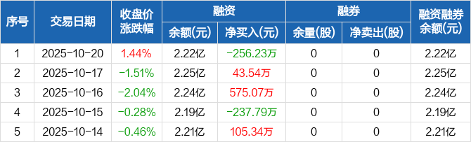 融资方面,当日融资买入530.54万元,融资偿还786.78万元,融资净偿还256.23万元。融券方面,融券卖出0股,融券偿还0股,融券余量0股,融券余额0元。融资融券余额合计2.22亿元。