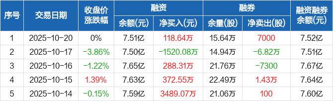 融资方面,当日融资买入2179.02万元,融资偿还2060.38万元,融资净买入118.64万元。融券方面,融券卖出7000股,融券偿还0股,融券余量15.64万股,融券余额97.47万元。融资融券余额合计7.52亿元。