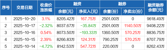 融资方面,当日融资买入1033.62万元,融资偿还865.87万元,融资净买入167.75万元。融券方面,融券卖出0份,融券偿还0份,融券余量2501万份,融券余额1413.07万元。融资融券余额合计9618.49万元。