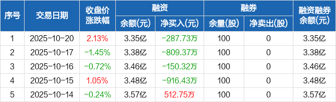 融资方面,当日融资买入1182.56万元,融资偿还1470.29万元,融资净偿还287.73万元,连续4日净偿还累计2163.86万元。融券方面,融券卖出0股,融券偿还0股,融券余量100股,融券余额1246元。融资融券余额合计3.35亿元。