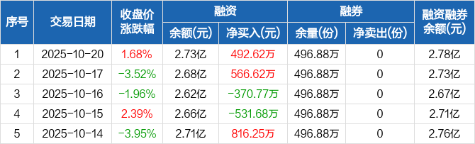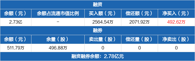融资方面,当日融资买入2564.54万元,融资偿还2071.92万元,融资净买入492.62万元。融券方面,融券卖出0份,融券偿还0份,融券余量496.88万份,融券余额511.79万元。融资融券余额合计2.78亿元。