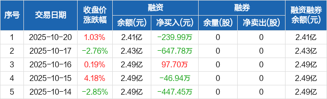 融资方面,当日融资买入1418.79万元,融资偿还1658.78万元,融资净偿还239.99万元。融券方面,融券卖出0股,融券偿还0股,融券余量0股,融券余额0元。融资融券余额合计2.41亿元。