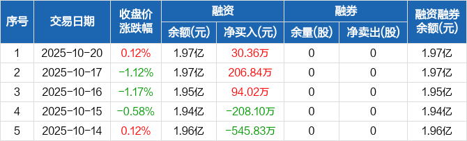 融资方面,当日融资买入355.19万元,融资偿还324.82万元,融资净买入30.36万元,连续3日净买入累计331.22万元。融券方面,融券卖出0股,融券偿还0股,融券余量0股,融券余额0元。融资融券余额合计1.97亿元。