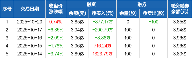 融资方面,当日融资买入611.7万元,融资偿还1488.87万元,融资净偿还877.17万元,连续3日净偿还累计1086.85万元。融券方面,融券卖出0股,融券偿还100股,融券余量0股,融券余额0元。融资融券余额合计3.85亿元。