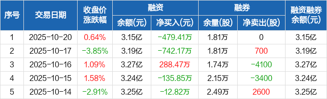 融资方面,当日融资买入664.02万元,融资偿还1143.43万元,融资净偿还479.41万元。融券方面,融券卖出0股,融券偿还0股,融券余量1.81万股,融券余额11.37万元。融资融券余额合计3.15亿元。