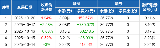 融资方面,当日融资买入947.67万元,融资偿还795.1万元,融资净买入152.57万元。融券方面,融券卖出0股,融券偿还0股,融券余量36.77万股,融券余额212.16万元。融资融券余额合计3.11亿元。
