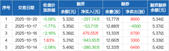 融资方面,当日融资买入1123.27万元,融资偿还1421.01万元,融资净偿还297.74万元。融券方面,融券卖出1.01万股,融券偿还1200股,融券余量13.77万股,融券余额183.55万元。融资融券余额合计5.34亿元。